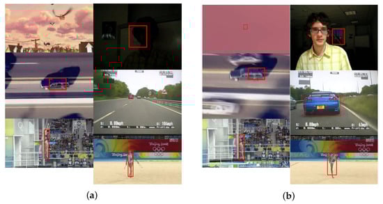 Merged VOT and VTB datasets. In (a), correctly marked bounding boxes are presented. (b) shows improper annotations: a fully covered object, wrong object, wrong object part, object not fully marked or inaccurately marked. Also visible are different images’ sizes.