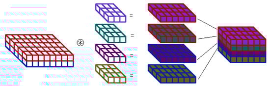Multi-depthwise convolution scheme. Two input features maps are convolved with 4 filters— 2 different filters for each map. The output map contains results of all 4 convolutions—edge colour points to the input map, colour of filling is related to filter. The output features order depends on implementation strategy.