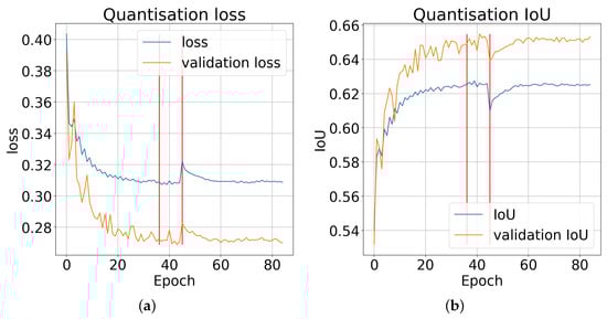 The quantisation process waveforms: (a)—loss and (b)—. The red lines indicate the epochs starting the quantisation of the normalisation layers and the change in the integer approximation method from to . The introduction of quantisation for the normalisation layers does not introduce significant changes in the error value and accuracy. Changing the approximation method causes a significant increase in the error value as well as a decrease in the accuracy.