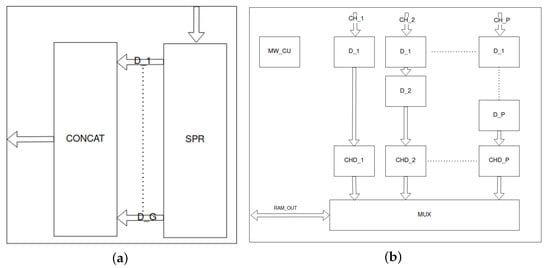 Grouper unit is presented in (a). Input signals are stored in the serial-parallel register (SPR). Next they are concatenated (CONCAT) into a wider package. (b) presents the memory writer unit. Parallel input channels () are delayed by blocks. The blocks determine the addresses for the valid data from each channel. Next, the multiplexer (MUX) iterates over channels and selects channel’s data, address and validity as output signals. The memory writer control unit (MW_CU) controls the entire module.