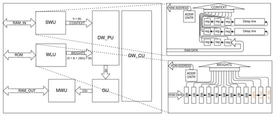 Depthwise layer accelerator scheme. The entire block depending on configuration consumes up to 10 DSP48 modules. Denotations: SWU—sliding window unit, WLU—weights loading unit, DW_PU—depthwise processing unit, DW_CU—depthwise control unit. SWU is implemented with a basic fine-grained stream method for context generation. WLU stores weights in serial-parallel register.