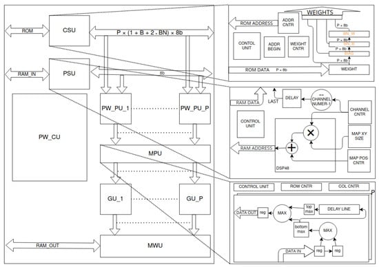 Pointwise convolution layer accelerator’s scheme. The input data stream is generated by the point stream unit (PSU)—the module uses proper counters to iterate over channels and determines signal of last channel of each point. Appropriate weights are streamed by the cyclic streamer unit (CSU)—incremented ADDR_CNTR (counter) is reset to ADDR_BEGIN when WEIGHT_CNTR (counter) achieves size of filter. Based on both streams, the pointwise processing units (PW_PU_x) calculate dot products. Next, the max pool unit (MPU) performs a max pool 2D operation on each channel. For each channel, for the next two elements, max function is applied. The result is properly delayed. Next, the results of subsequent lines are compared and the higher value is selected. The validity of the results and delay lines clock are dependent on the row and column of the pixel. The results are grouped in the grouper units (GU_x). For each group, the memory writer unit (MWU) assigns the memory address. The whole process is controlled by the pointwise control unit (PW_CU).