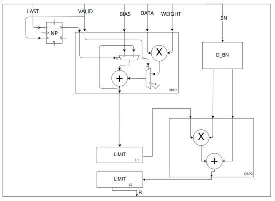 30]. DATA, WEIGHT and BIAS are 8-bit signals that represent input feature and filter weight and bias. BN is a pair of 8-bit signals—weights ofnormalisation. LAST is a one-bit signal that is high if DATA comes from the last channel of input data. DSP1 implements the MAC operation. The new point (NP) flip-flop allows the accumulator to be initialised with a bias value. DSP1 uses internal multiplexing based on NP state and data validation signal (VALID). The L2 and DSP2 blocks are optional depending on the configuration. The LIMIT blocks limit the input data to a range given by the fixed-point notation parameters or the applied