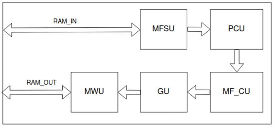Max finder unit (MFU)—finding parameters of the object for the highest validity. The max finder streamer unit (MFSU) generates a data stream. For each element of the stream, the position counter unit (PCU) assigns coordinates of map and anchor positions. The max finder control unit (MF_CU) implements the main functionality—it finds coordinates of the most probable object and its parameters. The resulting single bytes of object description are grouped in the grouper unit (GU). The aforementioned description are values of the anchor channels (