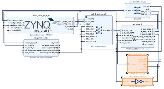 Block design with our accelerator and inverter of reset signal highlighted—our accelerator is reset with logical 1.