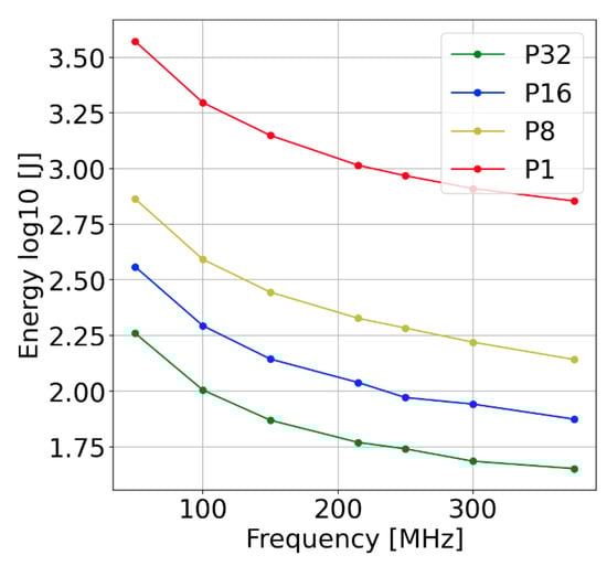Result of the experiments. Energy dependency on frequency and parallelisation. Applying higher frequencies and higher parallelism allows us to decrease total energy consumption (CPU + FPGA) for the processing of a fixed size dataset. The parallelism is limited by the available resources. The frequency is limited by the value that allows for correct results. The energy consumption saturates slightly with the increase in the frequency.