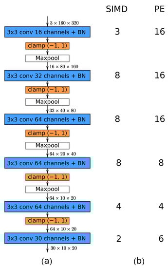 b) folding parameters for each layer. The number of processing elements (PE) and SIMD lanes used for each layer determines the level of parallelism. Note that the use of maxpool layers results in the reduction in spatial dimensions of the processed tensor. Therefore, fewer FPGA resources are needed for later layers of the network. For details, refer to