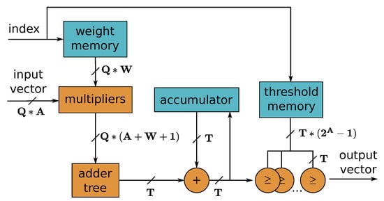 Single processing element (PE) used for dot product computation in FINN framework. Q input channels with A-bit precision are processed in parallel. The W-bit weights are stored in on-chip memory to avoid memory bandwidth bottlenecks. As a result of the fine-grained architecture of the system, the processed input pixels are accumulated sequentially before an output channel is computed. The values from the threshold memory are used for comparisons with the accumulated result to implement the required activation function.