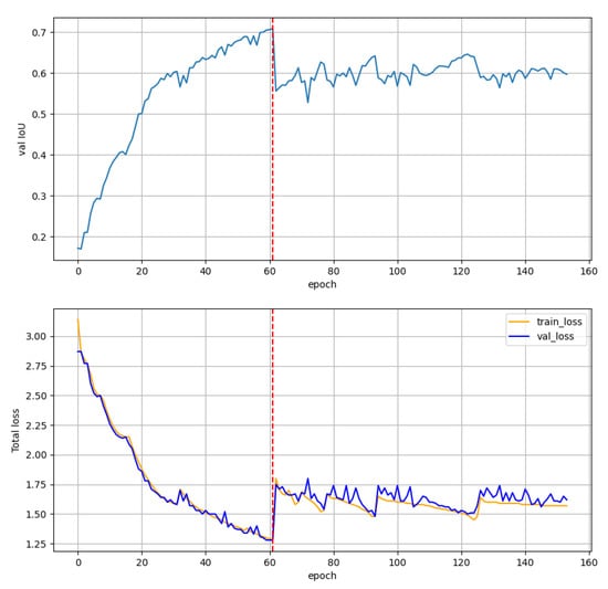The training procedure of the YoloFINN architecture. The dashed red line denotes the moment of changing the precision from 8 to 4 bits. Such level of quantisation was necessary to meet the constraints of the embedded platform.