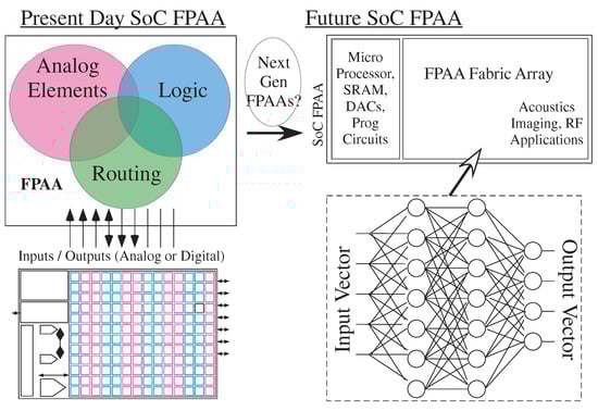 FPAA devices enable embedded Machine inference and learning [2,3,4], that includes neural networks (NN) and neurally inspired datapaths using analog elements and signals integrated with potential logic and mixed-signal-enabled routing (Figure 1). Analog implementations of NN have roots from the earliest demonstrations (e.g., [10,11]). FPAAs include analog elements and signals integrated with potential logic and mixed-signal-enabled routing (Figure 1), enabling full end-to-end, sensor to decision—computation that includes machine learning. FPAA devices, such as the SoC FPAAs, integrate analog and digital components, where FPAA devices that integrate analog and digital elements are a superset of FPGAs by integrating digital elements.