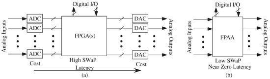 FPGAs are not low power when looking at solutions requiring 10–100 mW of power. Most FPGAs require 100 s of mW simply to power up the SRAM elements holding the programming variables. Commercial flash-based FPGAs significantly decrease the starting power requirements (e.g., 7–10 mW standby power [26,27]) while enabling 350–500 MHz signals and 70 mW 5 G SERDES, although the power requirements are too high for lower power systems of 10–20 mW and below. Analog computation (FPAAs) solves these issues energy and area efficient analog computation, as well as requiring far fewer data converters. Analog co-processors for a digital computation with a bank of data converters create a huge infrastructure that nearly eliminates the benefits of analog processing. Current FPGA-based solutions (Figure 2a) are used because of the lack of commercially available FPAAs, as well as the lack of available FPAA engineering experience.
