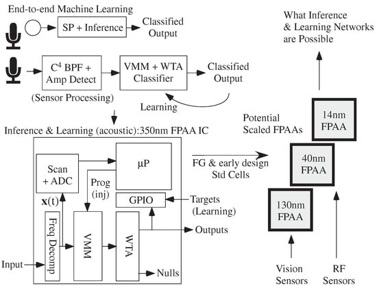 SoC FPAAs enable a mixed-signal end-to-end embedded machine platform as they include analog elements and signals integrated with potential logic and mixed-signal-enabled routing (Figure 4). End-to-end acoustic embedded learning and classification have been demonstrated at 20–30 μW on command–word recognition, as well as on the full Nzero database [2,3,4]. FPAA devices have experimentally demonstrated a wide range of computations (Figure 4) that include computations to set up machine learning, as well as the machine learning inference and learning, sometimes at small scale, given the component constraints of a 350 nm CMOS SoC FPAA [28]. Floating gate (FG) techniques enable programmability, having precise parameters (e.g., 14-bit accuracy [29]), in standard CMOS, as well as configurability, through long-term retention of FG charge (0–100 μV over 10 years [30]). SoC FPAAs enable a wide user development of the emerging analog computing techniques (e.g., [12]).
