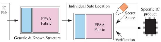 An FPAA device can be a completely generic and known device, completely verified in a safe location, and have the technology secret sauce be programmed in a safe location. The output product is a custom chip due to the nonvolatile device programming.