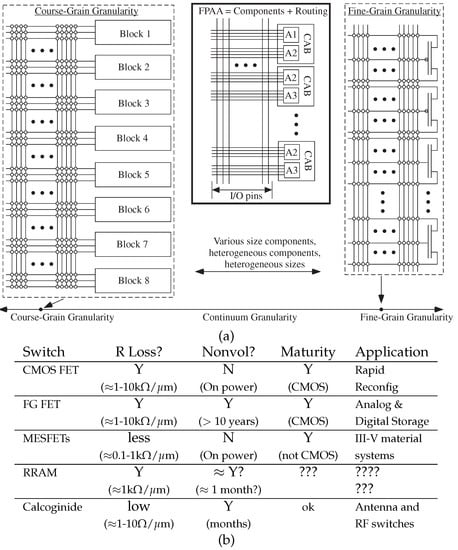 Impact of switches on routing architecture. (a) Continuum of FPAA routing granularity. (b) Switch types compared considering significant resistive (R) losses nonvolatile capabilities technology maturity for large-scale capabilities, and applications for these switches.