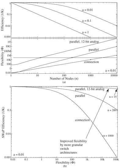 Fine-grain granularity, particularly analog programmable granularity, greatly improves the tradeoff between configurable architecture efficiency (1/K) and flexibility (), requiring fewer nodes for similar flexibility as well as having a lower cost (K) of that flexibility (Figure 8). The higher granularity by parallel analog connections significantly decreases the number of components (n 1000 to n = 15), and the resulting SWaP efficiency (1/K → 0.1% to 80%) illustrates the potential advantage using switch elements as programmable transistors. Decreasing the required number of blocks for the same illustrates the potential system-level reduction to achieve a range of potential applications.