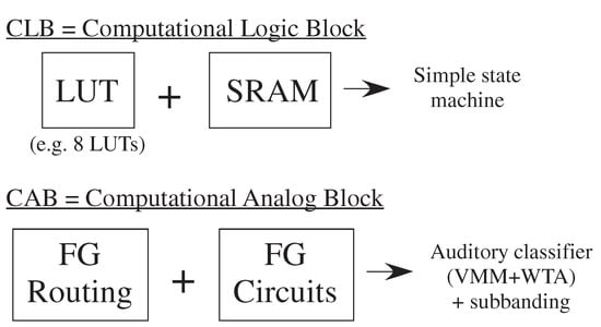 Comparison of the computation possible in a single local region, such as a computational logic block (CLB) or a computational analog block (CAB). A CLB typically uses binary connection switches to form multiple (e.g., 8) lookup tables and some selection RAM, enabling small state machines in a single CLB. A CAB typically uses analog parallel switches for its computation, that includes FG routing that can be used for programmable and configurable computation, as well as programmable FG-based circuits. Within such a structure, a small auditory classifier could be compiled in a single CAB.