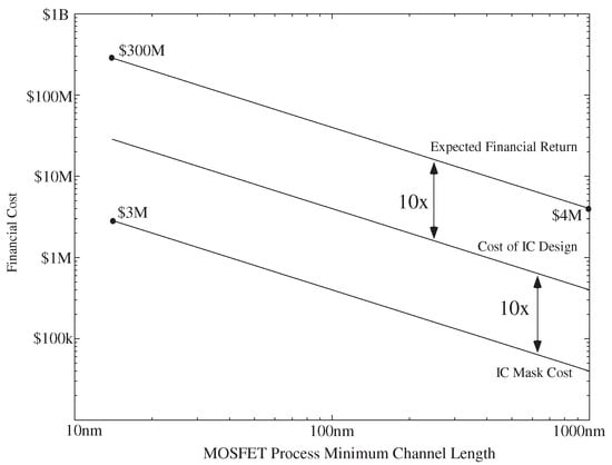 We want to understand the scaling opportunities for new machine-learning-capable FPAA devices, given the current FPAA capabilities. Configurable mixed-signal devices—-having the opportunity of flexibility in a reasonably granular solution—can justify the IC design cost for new embedded devices (Figure 10). As mask costs exponentially increase with decreasing processing node, the resulting design costs to obtain value from these investments exponentially increases, requiring a significantly higher expected market return from the effort (Figure 10). Only a few applications (e.g., cell phone processors) can have the market impact that are necessary to justify the cost of advanced IC nodes (e.g., 10 nm, 14 nm), where configurable solutions can utilize a single IC design across a number of applications to justify the investment cost.