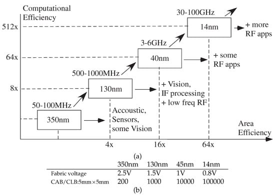 Given the demonstration of high flexibility of fine-grain capabilities compared with architectural cost, as well as demonstration of SoC FPAAs for embedded machine inference and learning [2,28], we ask the following question: What is the potential of these FPAA devices given the existing understanding of these techniques? Scaling allows for a higher signal bandwidth in the FPAA fabric architectures (Figure 11a), roughly with an inverse quadratic scaling on the minimum channel length, enabling some RF bandwidths (e.g., 4 GHz) at 40–45 nm CMOS [67,68].