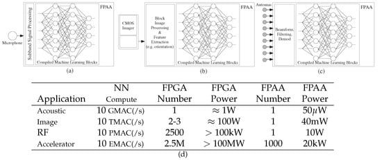 A single 40 nm FPAA device (Figure 12) could potentially be used for an acoustic NN classifier, an image NN classifer, and an RF NN classifer. These examples provide a good comparison with a single high-end (e.g., RF Zync [24]) FPGA IC (12–16 nm CMOS), solving these applications (Figure 13). The 5 GHz FPAA bandwidth (dc to 5 GHz [67]) compares to the highest-end 10 GSPS DACs on the RF Zynq [24]. The FG elements that are not programmed are initialized to accumulation, and the negligible current (e.g., [67]) results in little static power required in a 40 nm node. An FPGA has significant initial static power (100’s of mW to W) because of the on-chip SRAM storage. A 40 nm CMOS FPAA would have roughly 20 k CABs and CLBs with roughly 50 M multiplication elements in the FPAA fabric that are likely to be typically accessible. The highest end Zync processor has roughly 50 k CLBs and 4 k DSP (with single multiply) units. This 40 nm FPAA device would be similar to the 350 nm SoC FPAA, likely with multiple embedded processors (MSP430 or RISC V) in an open design architecture; Zync includes 6 ARM cores with a 1–2 GHz maximum clock rate. A 14 nm FPAA device should have improved metrics; a 40 nm FPAA device requires considerably lower building costs and design costs.