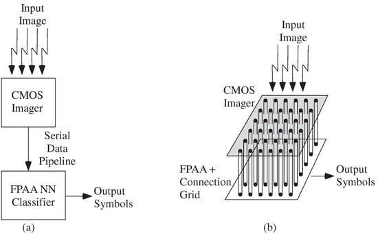 Typical image processing and NN classification architectures would build around an image IC that transmits an image one pixel value at a time (Figure 14a). Matching data and computing speed results in optimal computing efficiency and minimal overhead minimizing the expensive requirement for buffering or caching data. An alternate path could enable a CMOS imager to have direct interconnections between a pixel and reconfigurable Si processing on another IC that would enable significantly higher computing opportunities (Figure 14b). Unlike the trajectories for single wafer imagers (e.g., [80,81]), through-hole wafer connections and die stacking (e.g., [82,83]) enable a wide range of opportunities for 3D die-stacked imagers [84,85,86,87,88,89]. Image processing would have CABs or groups of CABs for handling different symbols. Data moves throughout the IC and utilizes local computing in the memory. A 10 M Pixel imager requires an average of 10 TMAC (/s) at roughly 10–20 mW in the FPAA device, similar cost as the CMOS imager, and similar cost in transmitting the data between the two chips on a PCB. If an imager has vertical connections from one wafer to another, then the vertical connection would change the algorithm and more parallelism would occur due to parallel input (naturally from source).