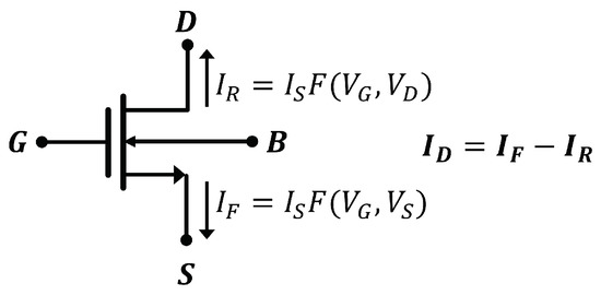 In the long-channel ACM model [13], the drain current in Figure 1 is split into the forward term and the reverse term , both of them dependent on the voltage . The component also depends on , while depends on . This source-drain symmetry is given by using (1).