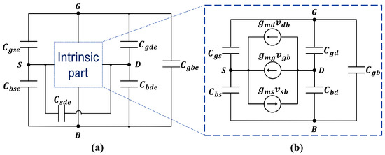 In Figure 3a, the extrinsic capacitance includes an unavoidable overlap between the gate and the source (drain) diffusion and fringing capacitances, while the substrate-source (drain) junctions modeled by (nonlinear) diode capacitances correspond to . A more complete model for the extrinsic part should include parasitic resistances as well [15].