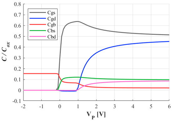 Figure 4 presents plots of the five intrinsic capacitances normalized to as functions of the pinch-off voltage. The curves were obtained for an NMOS transistor with and .