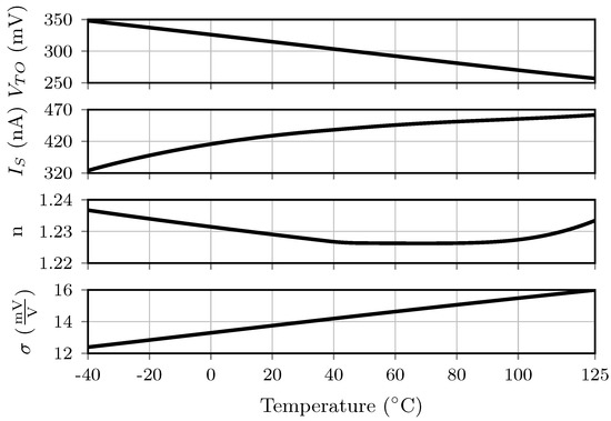 Figure 7 shows the dependence of the parameters of the 4PM on the temperature of an NMOS transistor with = . As expected, the threshold voltage is a linearly decreasing function of the temperature [18], whereas the DIBL factor increases linearly with temperature [19,20]. The slope factor is, for practical purposes, independent of the temperature. The dependence of the specific current on the temperature is, in general, not predictable due to uncertainty in the variation of the mobility with the temperature.