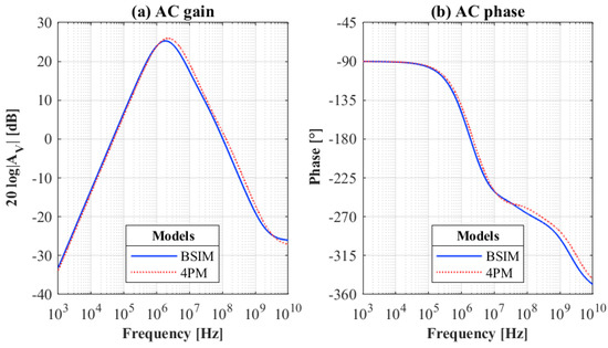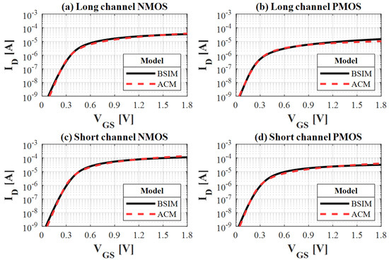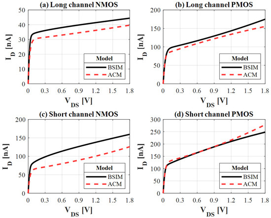 Overall, the Verilog-A simulation for long- and short-channel transistors provided results close to BSIM’s. Notably, for high values of , the drain current of the 4PM drifts away from BSIM’s due to effects that are not taken into account in the ACM model used herein.