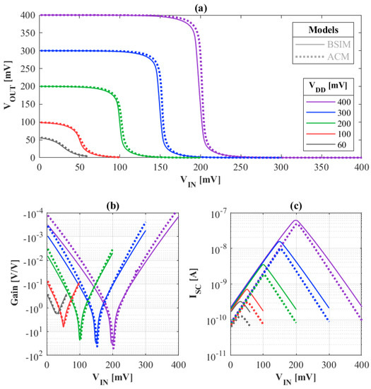 The design was validated through a DC analysis in Cadence® by using each model (4PM and BSIM 4.5) separately. The results of the DC simulations for five different supply voltages s at room temperature and typical conditions are depicted in Figure 11, which includes the voltage transfer characteristic (VTC), small-signal gain and short-circuit current (). From Figure 11, it can be verified that the ACM model with only four parameters is sufficient to properly describe the electronic behavior of the classic CMOS inverter in the ULV domain.