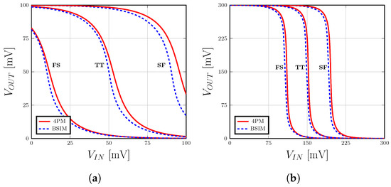 Voltage-transfer characteristics of the CMOS inverter using BSIM and the 4PM across the corners of process variation. (a) = 100 mV. (b) = 300 mV.