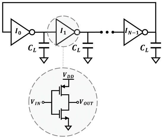 In Figure 13, the ring oscillator comprises N CMOS inverters in a loop and the load capacitance in between stages, which includes external capacitors that load each node, along with the transistors’ intrinsic and extrinsic capacitances presented in Section 2.2. The load capacitance is crucial to set the frequency of oscillation and is critical for the successful start-up of the oscillator.