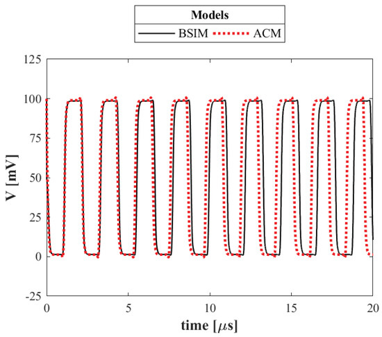 Figure 14 presents the voltage signal at one of the stages of the ring oscillator for the supply voltage of 100 mV. Table 4 summarizes the frequencies obtained through the use of either ACM or BSIM for various values without the inclusion of any external capacitor.