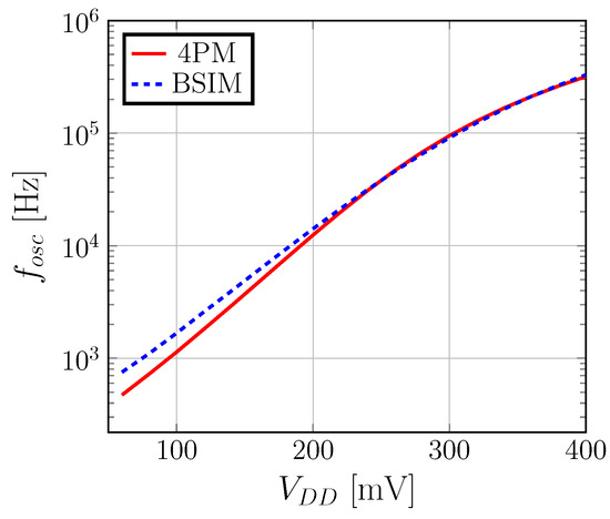 As expected, due to a lack of extrinsic capacitances associated with fringing and diode junctions [15] in the implemented dynamic model, the frequency of oscillation using the 4PM was higher than BSIM’s overall. Table 4 shows that the oscillation frequency obtained through the 4PM diverged from the frequency obtained through BSIM at 300 mV and 400 mV for more than 200%, which suggests that the implemented dynamic model lacks sufficient information to provide frequency results closer to BSIM’s in these voltages.