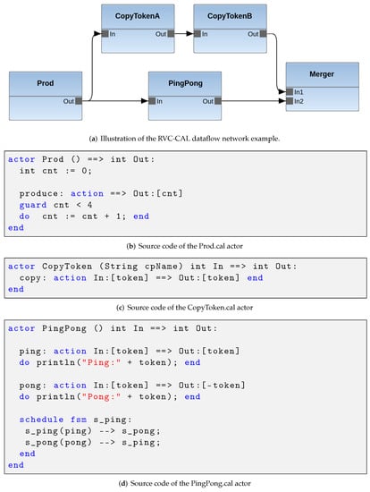 Example illustrating the main properties of the RVC-CAL program and how it is structured. This example contains five actors (i.e., Prod, CopyTokenA, CopyTokenB, PingPong, and Merger).