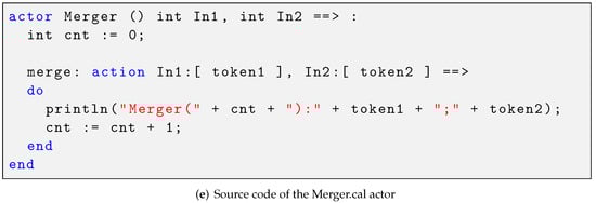 As an example, Figure 1 shows an RVC-CAL dataflow program. Figure 1a depicts the graphical representation of the program, where the blue boxes are the actors, while the directed arcs represent the buffers. Specifically, this network consists of five actors (i.e., Merger, PingPong, CopyTokensB, CopyTokensA, and Prod) and five buffers. Figure 1b shows the RVC-CAL implementation of the Producer actor: this is composed of a single action that produces a token for each execution (firing), during which it increments the internal variable counter each time. A guard condition prevents the action from being followed more than four times. In the PingPong actor code shown in Figure 1d, the schedule construct is used to define an internal finite state machine (FSM), which defines how the execution of action pp1 must be alternated with the execution of action pp2.