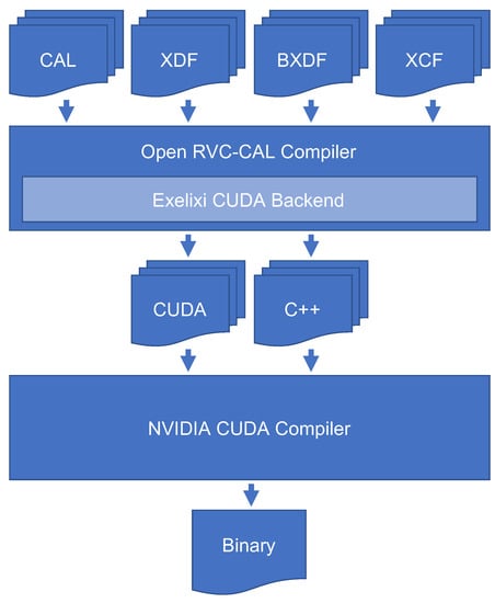 In the following section, it is explained how the methodologies developed in previous research (considering also the ones designed and implemented by the authors of this paper) were extended to more efficiently support the systematic partitioning of DPN software applications. To achieve this goal, the tool set illustrated in Figure 2 was utilized. Starting from the top, the figure shows the high-level representation of the dataflow program (CAL), the network setting (XDF), the configuration files that provide partitioning information, and buffer sizes (BXDF). These represent the input to the ORCC compiler, which uses the Exelixi CUDA backend described in [8,29,30] to automatically write the respective CUDA/C++ low-level software. This code must then subsequently be compiled using Nvidia CUDA Compiler (NVCC) to obtain the program binary. Furthermore, the following section describes a new design for the FIFO buffers that are utilized for communication between neighboring actors. Along with this, a novel scheduling strategy for actors executing on GPUs is presented. Lastly, it is shown how SIMD parallelization methodologies are used to accelerate the runtime of dataflow actions to improve execution performance.