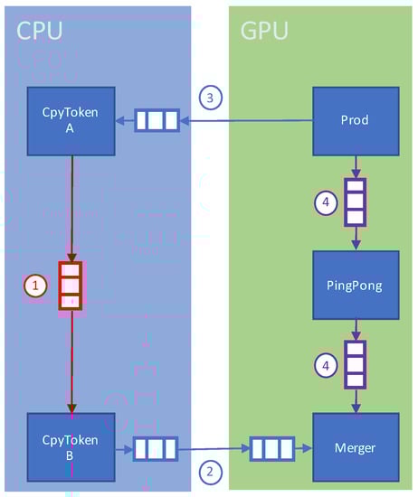 In this article, a novel method for a cross-hardware FIFO buffer was designed by using the capabilities offered by the new CUDA APIs and architecture capacities summarized in Figure 3 with a blue ➂. With this goal in mind, the memory allocated on the CPU platform is a pinned memory. This signifies that the operating system does not swap allocations or transfer them to another physical memory location. These memory allocations are subsequently registered in the virtual address memory management of the GPU from which translated pointers are obtained. With this approach, different pointers are dereferenced if the data are manipulated from the GPU system or the CPU system. The main benefit of this method is that it removes the necessity of any software API or synchronization calls. In fact, memory accesses are performed automatically by the hardware platform. It is important to note that this solution does not change the rest of the computation model or the way FIFO buffers are used.
