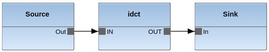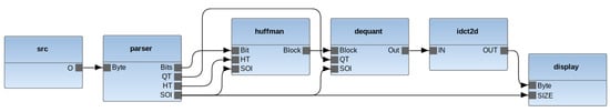 Figure 6 reports the dataflow network of the JPEG decoder application program that was chosen for the experiments. The network is composed by six actors. The JPEG decoder is a well-known application, and the corresponding dataflow source code is publicly available in the following web repository [31]. In this second experiment, the idct2d actor parallelized as in the tests described above was used in the dataflow network implementing the full JPEG decoding algorithm. In this experiment, the application program is essentially used to validate the semantic correctness of the generated code for a generic dataflow program. The application is sufficiently complex, and it was not explicitly designed and optimized for exploring efficient GPU parallelization options. In terms of performance, Table 3 reports the experimental results in terms of the obtained performance, respectively when the idct2d actor is sequentially executed on the GPU (such an implementation is consistent with the methodology previously developed and reported in [8]) and when all other actors processing tasks are executed on the CPU partition. The second experiment corresponds to the improved methodology in which the idct2d actor is executed in parallel on the GPU platform. It can be observed that this experiment employing the parallel GPU implementation results outperforms by a speedup of 9.67 or 18.3 the sequential implementation of the first experiment depending on the hardware system.