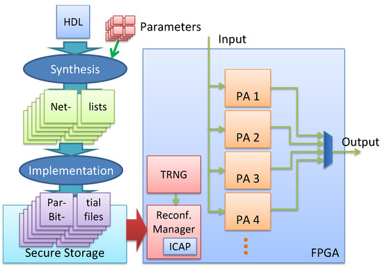 - Hettwer, B.; Petersen, J.; Gehrer, S.; Neumann, H.; Güneysu, T. Securing cryptographic circuits by exploiting implementation diversity and partial reconfiguration on FPGAs. In Proceedings of the 2019 Design, Automation & Test in Europe Conference & Exhibition (DATE), Florence, Italy, 25–29 March 2019; pp. 260–263. [Google Scholar]