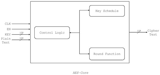As a case study, we have used the reference AES architecture provided by the ChipWhisperer [17]. The implementation requires 4547 Look-up Tables (LUTs) and 785 registers. The implementation consists of a Round Function module and Key Scheduling module. Both of these modules are instantiated in a Core entity as shown in Figure 2. A finite state machine determines the next mode of operation, initialization state, intermediate or the last round, output available, etc. Key Schedule is a module that expands and generates keys for each round based on the given secret key. The Round Function module consists of the main subfunctions of AES—AddRoundKey, SubBytes, ShiftRows, and MixColumns.