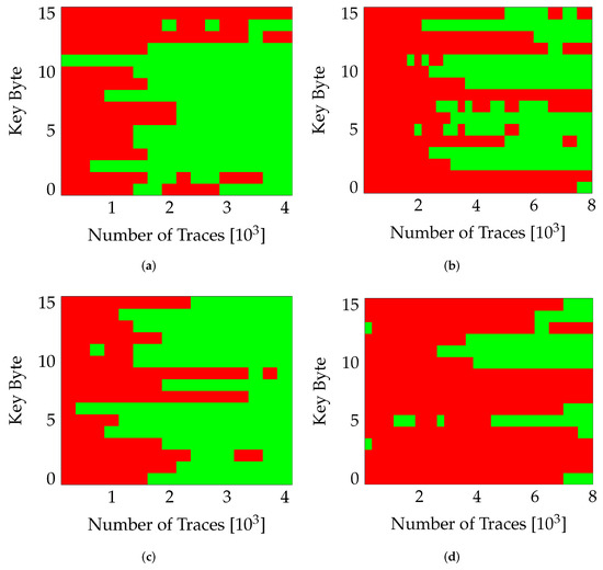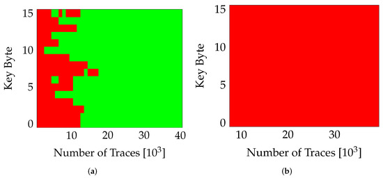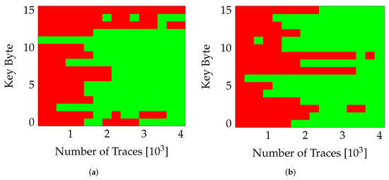 As mentioned earlier (in Section 5), the proposed PR system consists of two partial regions. Since the fabric of an FPGA is not completely homogeneous, the placement of variants in a particular region would result in a different implementation of the encryption algorithm. This has a direct influence on the power consumption and consequently the difficulty of attack. Figure 5, shows the influence of placing a variant (v0) in different partial regions. The figure show the number of traces required to extract the correct value (green block) for each key-byte (0 …15). It can be seen that the attack becomes slightly more difficult when the variant is located in PA0 (Figure 5a) compared to PA1 (Figure 5b), where the entire key was extracted successfully. Similar behavior was observed for other variants as well, with the variants placed in PA0 providing more resistance to the extraction of correct key. The USB clock and PR were switched off during these measurements.