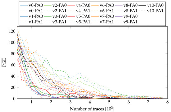 To obtain more insight into the influence of PR, we observe the difference in Partial Guess Entropy (PGE) [20] values of the static and active PR systems. The PGE is a metric to rank the correct value. For more details on PGE, please refer to Section 2.2 in [20]. In the case of SCA, the PGE serves as a measure of how far away the guessed key value is from the actual key. Higher the PGE value, the more difficult it becomes to extract the correct key. For a perfect match, the PGE value is 0. Figure 8 and Figure 9 show the values (averaged over all key-bytes) for a static system without PR (nopr-static) on fixed and random locations respectively. As seen in Figure 8, in a static system, there is a rapid convergence of values to 0 for all 20 variants. A similar behaviour was observed (see Figure 9) with the random location of variants. For ~8000 the correct key values can be extracted for all the variants. Meanwhile, the results for a system with active PR (pr-active) are shown in Figure 10. With PR active (Figure 10), none of the variants reached a value of 0, even with ~40,000 traces.