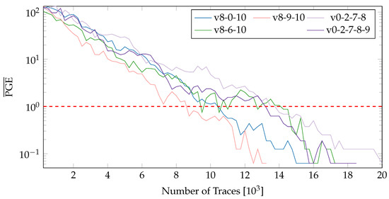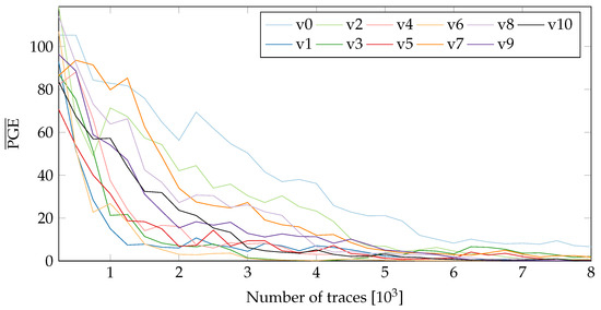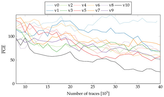 After ranking the variants in accordance with their resistance to SCA, we combine variants to form groups of different sizes. The variants present in a group can then be exchanged dynamically using the proposed PR system. Figure 12 exhibits the values for groups of size 3, 4 and 5. The groups include a mixture of both high and low quality variants. While the first three groups exchange a single variant (v6,v0,v9) to observe the influence of a variant in a group, the remaining lines (v0-2-7-8 and v0-2-7-8-9) show an increase in the size of the group. From the results in Figure 12, several important observations can be made: