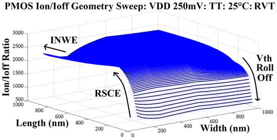 Geometric sweeping of the chosen technology node was performed at subthreshold voltages across SS/TT/FF corners, both VT types and both device types to determine susceptibility to the technique. Figure 2 shows the typical corner response for the RVT PMOS device. The threshold voltage roll-off as a result of SCE highlights the danger of minimum length sizing in the subthreshold. RSCE pushed the optimal geometry to a higher device length and INWE pushed the optimal geometry to a lower device width. Cumulative results revealed subthreshold Ion/Ioff ratios in the typical corner of 1500/2500 for LVT/RVT, respectively, suggesting that RVT was the superior choice for energy critical applications. Both RSCE and INWE optimisation proved to have a greater impact on LVT devices due to the balance of HALO dopant densities with the background channel in the chosen technology. Corner analysis revealed RSCE greater in the slow corner and INWE greater in the fast corner. This is congruent with the notion that dopant depth forms part of the global variation corner, with high surface dopant density forming part of the slow corner profile and low surface dopant density forming part of the fast corner profile.