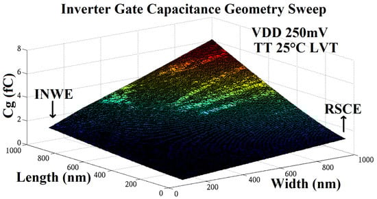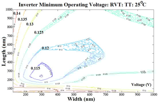 Under aggressive voltage scaling, MOS devices begin to exhibit ohmic behavior, with the voltage dropped across them accounting for a larger proportion of the rail to drain voltage, degrading the voltage swing and therefore noise margins. By definition, CMOS logic may only be deemed functional with positive noise margins. A test bench was created to test the impact of device geometry on this form of robustness. The test bench generated the voltage transfer characteristic of a geometrically balanced inverter by sweeping the input voltage. The input high and input low voltage thresholds were determined at the points where the first order derivatives of the transfer characteristic equal −1, common practice within the field. The output low and output high voltages were determined at the corresponding input voltages. The practical minimum operating voltage was then determined to be the point at which the high or low noise margin was reduced to 10% of the supply voltage (also common practice). The test bench was swept geometrically across the same 5 nm manufacturing grid as the other test benches. Figure 5 shows the RVT inverter results for the typical corner. A local minimum of 109 mV was observed at a length/width of 240 nm/300 nm. For LVT, the focal point was much higher in both dimensions and greater in magnitude at 133 mV. This is likely due to the greater current contention of the complementary off device, a result of the lower Ion/Ioff ratio. The high gradient from the minimum dimensions to the focal point (apparent in both VT’s) demonstrates that a large improvement in robustness may be achieved by only a slight upsizing in geometry.
