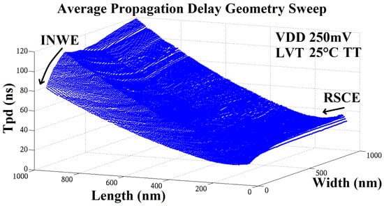 A 5-stage FO4 (Fan-Out of 4) inverter chain to simulate the average propagation delay (a function of both current and capacitance) was created and geometrically swept in the same fashion. Measurements consisted of rising/falling triggers taken on the input and output at the 50% VDD boundary. Figure 4 shows the sweep for the LVT inverter at the typical corner. RSCE pushed the average propagation delay lower as device length was increased from minimum, towards an optimum length, before beginning to rise once again. For the LVT TT corner, the optimum length was 150 nm, up from the minimum length of 60 nm. INWE pushed the average propagation delay lower as the device width tended towards a minimum. Once again, these effects displayed a greater impact on LVT devices. The result of this was better delay optimisation for LVT devices at the cost of larger LVT footprints (increase in device length equates to an increase in standard cell width).