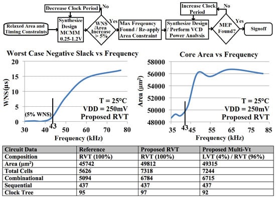 To determine the minimum energy point, the maximum frequency was provided as the initial timing constraint along with a fixed area constraint as measured at the maximum frequency and a variable area utilisation ratio. The same synthesis stages were performed as above but the parasitically extracted design, complete with SDF timing data, was then simulated with a test vector using a commercial EDA simulation tool over 20 BIST cycles. This produced a value change dump (VCD) containing net toggle data. This was then passed back into the static timing analysis tool to generate accurate power and dynamic/leakage energy data. The whole synthesis was then iterated over relaxing timing constraints until the full total energy curve was established. The signoff frequency chosen for each core was the frequency at the minimum energy point. These were 16.79 kHz/25.22 kHz/51.87 kHz for the reference, proposed RVT and proposed Multi-VT, respectively, giving energy-per-cycle values of 3.27 pJ/3.81 pJ/3.28 pJ. Contrary to the intuition of the underlying physics, this suggested that the proposed technique might produce less efficient designs. Figure 7 shows the signoff design metrics. The Multi-Vt core consisted of 4% LVT and 96% RVT cells, a complete reversal of the maximum frequency synthesis VT breakdown. The cell counts for the proposed RVT and proposed Multi-Vt libraries were 30%/28.6% greater, respectively. However, the total area increase was only 8.9%/7.8%. Investigation revealed the cell count increase to be logical decomposition by the synthesis tool as a result of the richer variety of cells provided by the proposed technique. Cell width increase from RSCE optimization accounted for the majority of the area increase.