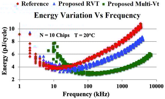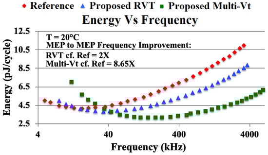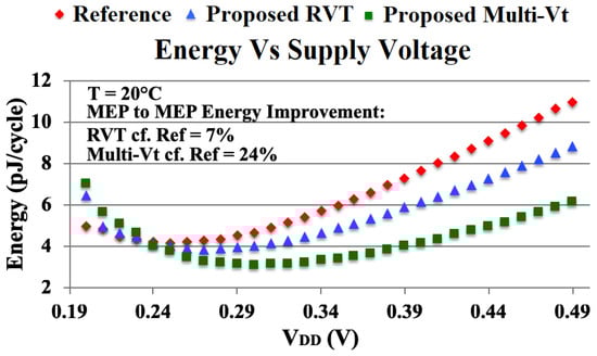 Figure 8 and Figure 9 show the relevant metrics under nominal operation—MEP to MEP at nominal temperature (20 °C), the total energy-per-cycle of the cores measured 4.12 pJ/3.84 pJ/ 3.11 pJ for the reference, proposed RVT and proposed Multi-Vt cores, respectively. This represents energy improvements of 7%/24% compared to the reference core and suggests that the BSIM4.5 models used to simulate the signoff designs underestimated the energy requirements of the reference design and overestimated the energy requirements of the proposed designs. The frequencies of the cores measured 17 kHz/34 kHz/147 kHz for the reference, proposed RVT and proposed Multi-Vt cores, respectively. This represents frequency improvements of 2×/8.65× compared to the reference core. Whilst the signoff simulations appear to have accurately predicted the performance of the reference design, they largely underestimated the performance increase of the proposed technique.