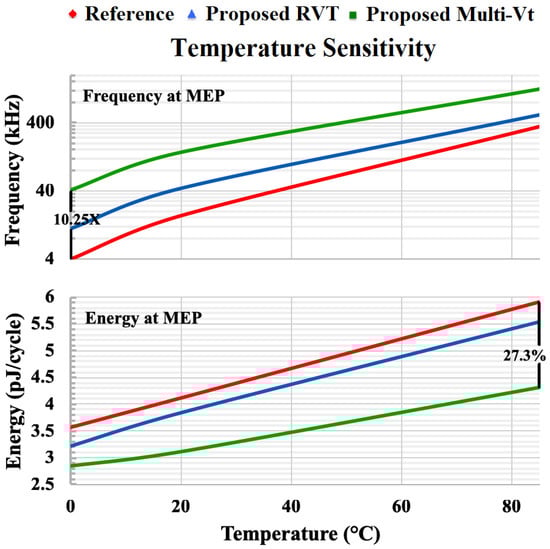 The combined effect of an increase in leakage current and decrease in dynamic energy consumption consistently pushed the MEP lower in energy and to a higher supply voltage and frequency across the measured temperature range (0 °C–85 °C), as compared to the reference library. This suggests further energy gains may be available at the circuit level by the application of techniques such as power gating or duty cycling to further reduce or eliminate leakage energy. These techniques display higher benefit to the previously cited work [5], where energy gains were already derived from leakage energy reductions. Moreover, higher supply voltage operation results in reduced sensitivity to local and global variation, as well as easing efficient DC-to-DC voltage regulator design [10].